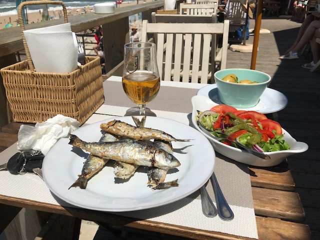 Before I made it to Cascais I stopped to eat some local sardines at a Beach restaurant….